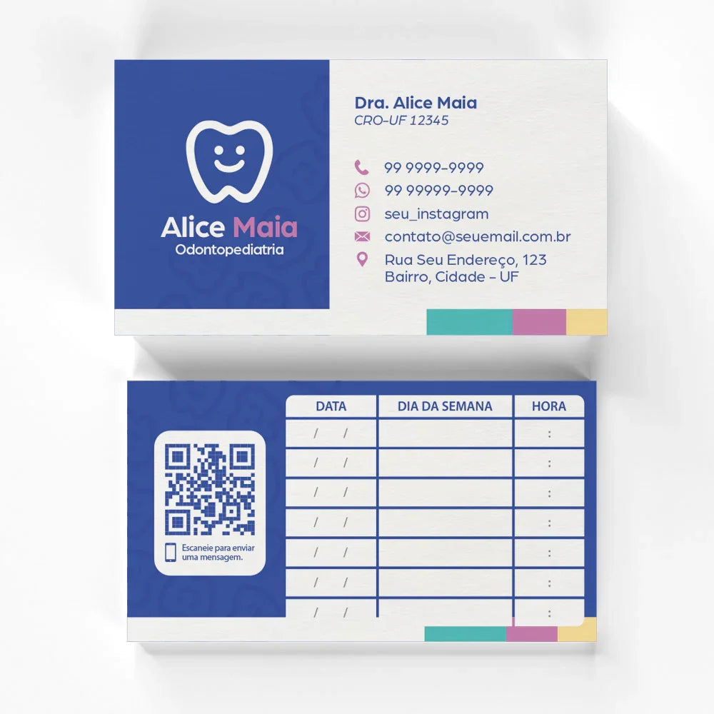 Cartão de Retorno Odontológico é ideal para o agendamento e o comparecimento às próximas consultas. Criado para tornar o acompanhamento do tratamento mais eficiente, esse cartão é uma ferramenta simples, mas essencial para manter a comunicação clara entre o consultório e o paciente. Possui formato retangular, totalmente personalizável, produzido em papel couché 300g, com 8,7 cm de largura por 4,7 cm de altura, colorido frente e verso.