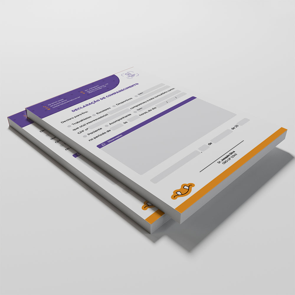 A Declaração de Comparecimento Odontológica é um documento essencial para comprovar a presença do paciente em consultas ou procedimentos. Ideal para fins legais, trabalhistas ou escolares, ela oferece um formato padronizado, com espaço para data, horário e assinatura do profissional. Um material indispensável no dia a dia do consultório, que transmite profissionalismo e segurança. Possui dimensões A5 (15 x 21 cm), papel Offset 90g e impressão colorida 4x0, cada bloco contém 100 folhas blocadas com cola para facilidade de uso.