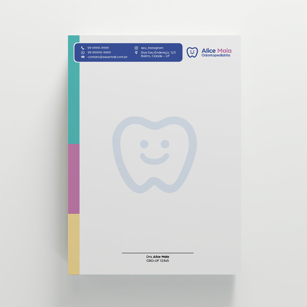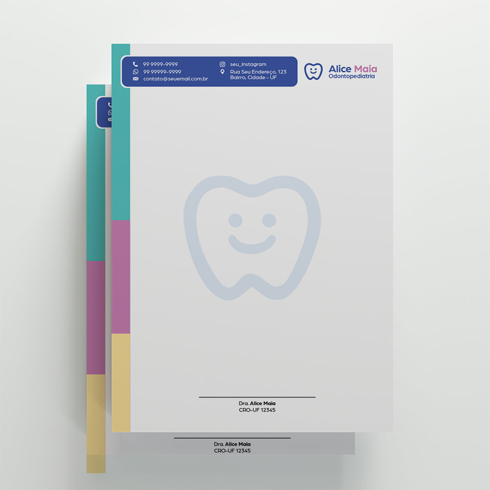 Você pode anexar o seu logotipo no campo acima e descrever todas as alterações que desejar livremente, como mudança de cores, adicionar ou remover informações de contato, endereço ou redes sociais, nome do(a) dentista, CRO etc.
