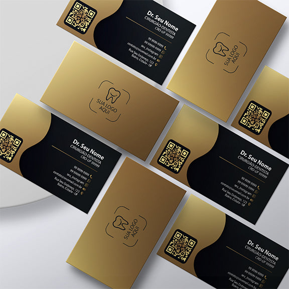 Cartão de Visita Odontológico com formato retangular, totalmente personalizável, produzido em papel couché 300g, com 8,7 cm de largura por 4,7 cm de altura, colorido frente e verso.